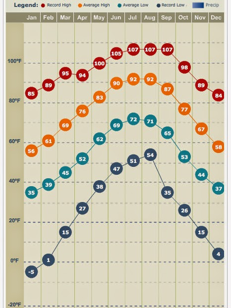 Take a look at these 48 data points. Consider different pairs of monthly high & low records: -5 & 85 (Jan.); 54 & 107 (August). There are 80 and 53 degrees difference, respectively, between those two sets.